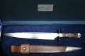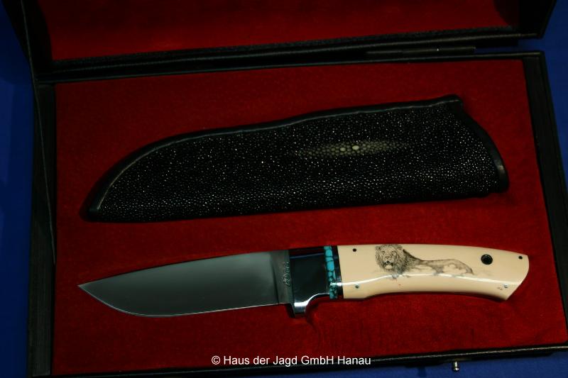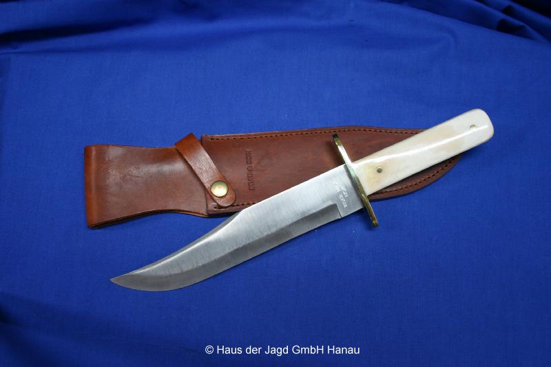 440 C-Stahl, Griff: Knochen, Parierstangen: Messing, Lederscheide |