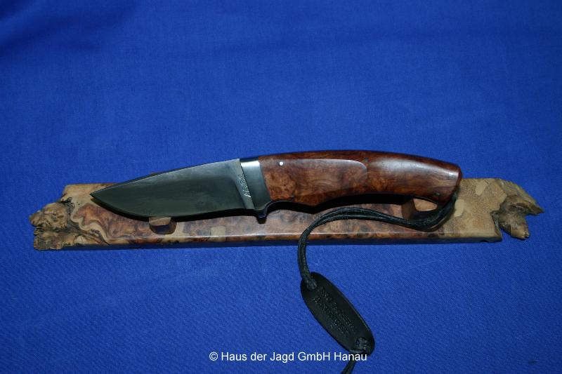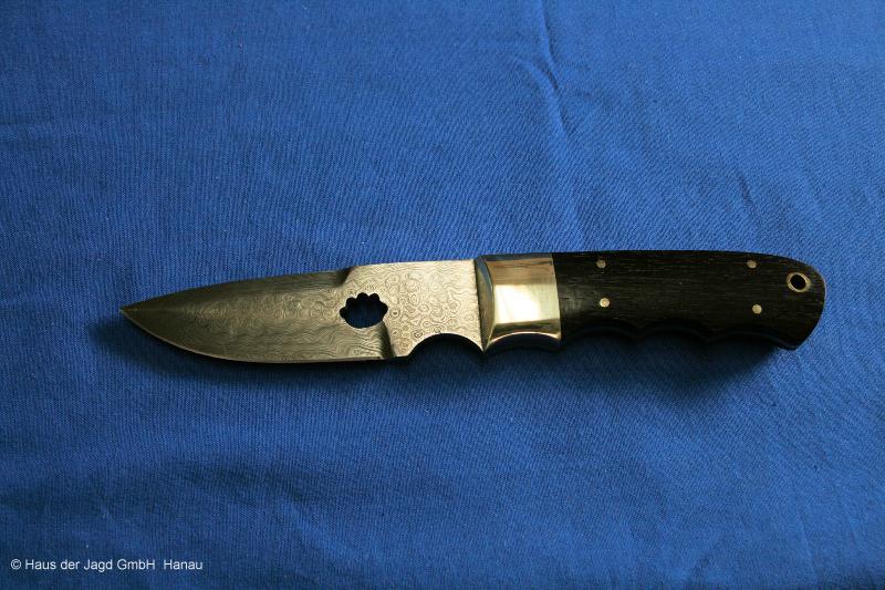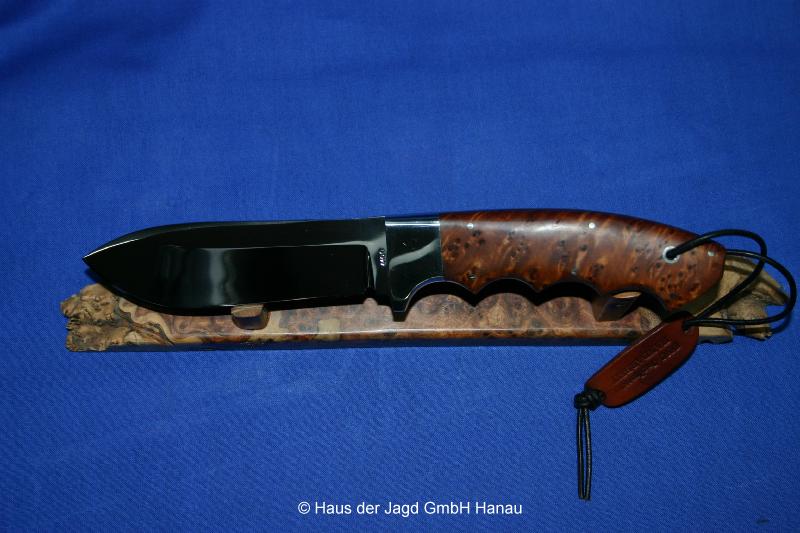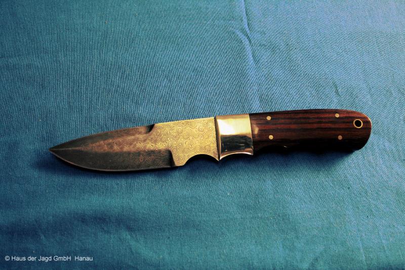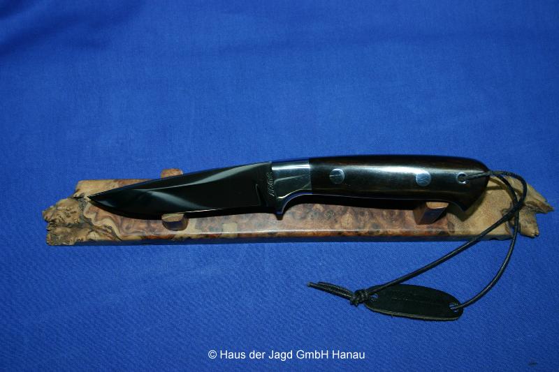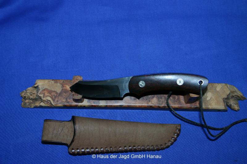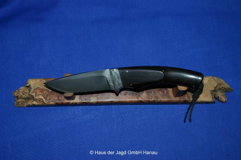 Klinge 9,0 cm, 440 C-Stahl, Griff: Mooreiche, Parierstange: Neusilber, Messingeinlage im Griff,