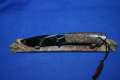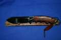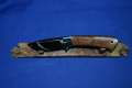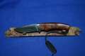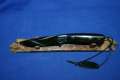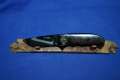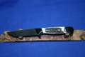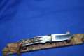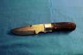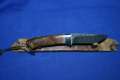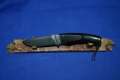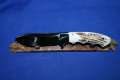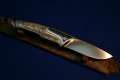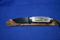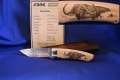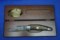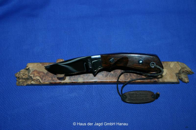 Klinge 8,5 cm, 440 C-Stahl, Griff: Wüsteneisenholz, Messingeinlage "Bär" am Parierstück,